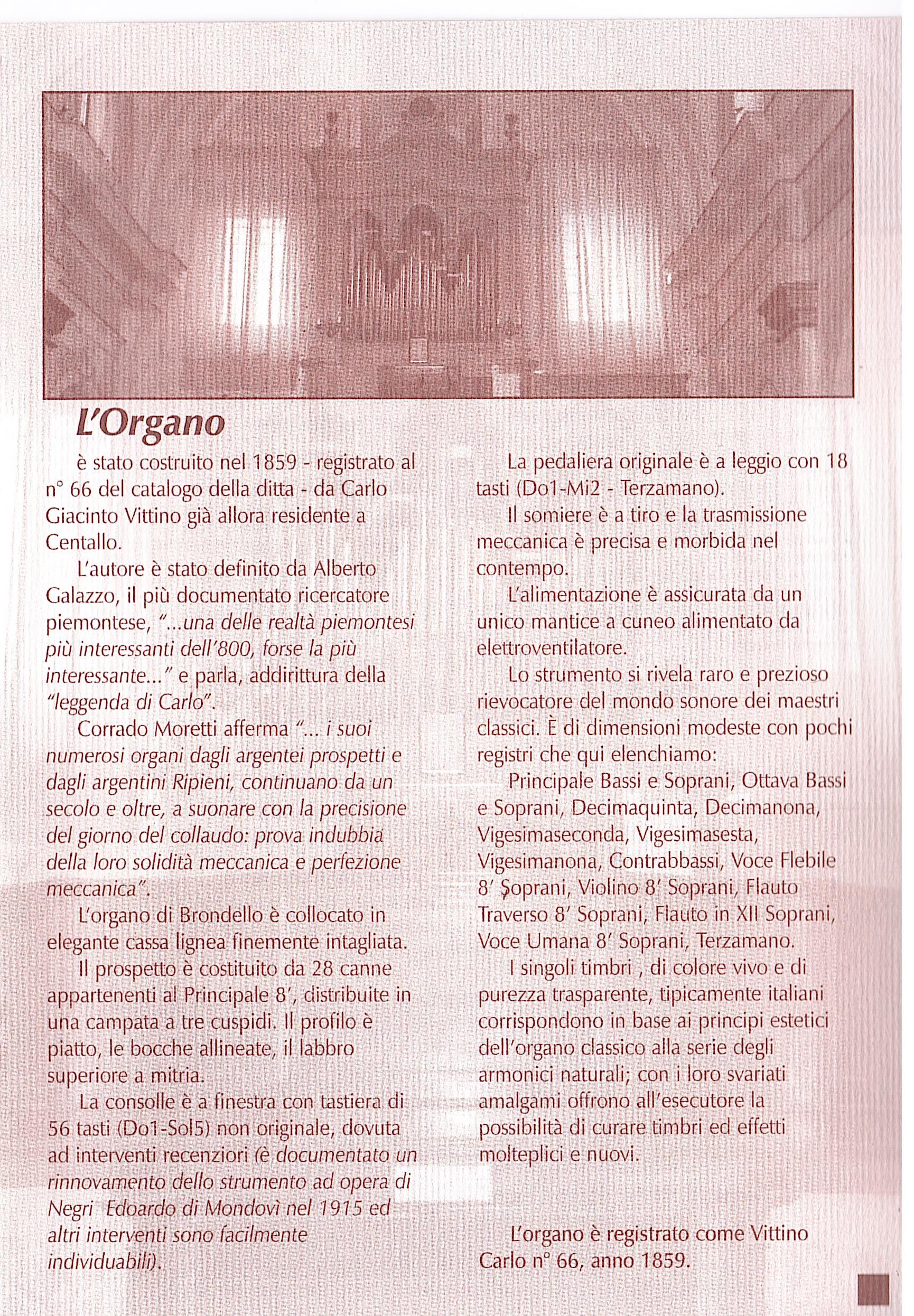 "L’organo della Parrocchiale di Brondello, è stato costruito nel 1859 – registrato al n° 66 del catalogo della ditta - da Carlo Vittino di Centallo. L’autore è stato definito da Alberto Galazzo, il più documentato ricercatore piemontese , …“ una delle realtà più interessanti dell’800, forse la più interessante …” e parla addirittura della “leggenda di Carlo”. Corrado Moretti afferma “ … i suoi numerosi organi dagli argentei prospetti e dagli argentini Ripieni, continuano da un secolo e oltre, a suonare con la precisione del giorno del collaudo : prova indubbia della loro solidità meccanica e perfezione meccanica.”